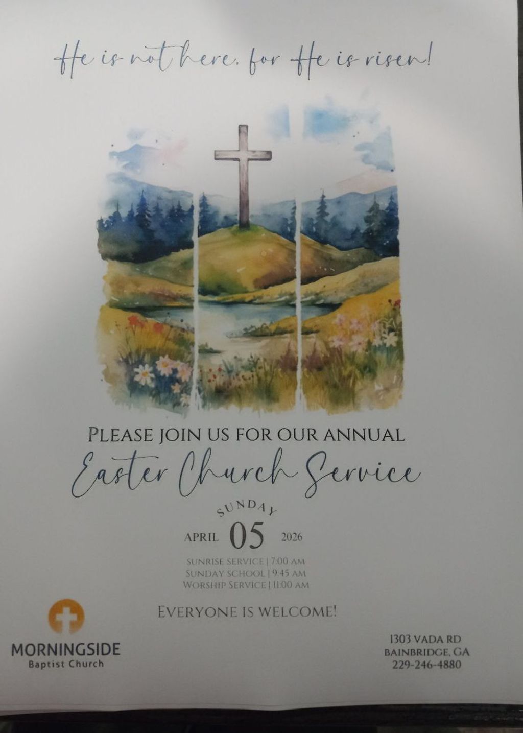 Regular SS @ 0945 and AM Service @ 1100. No Evening Services on Easter.